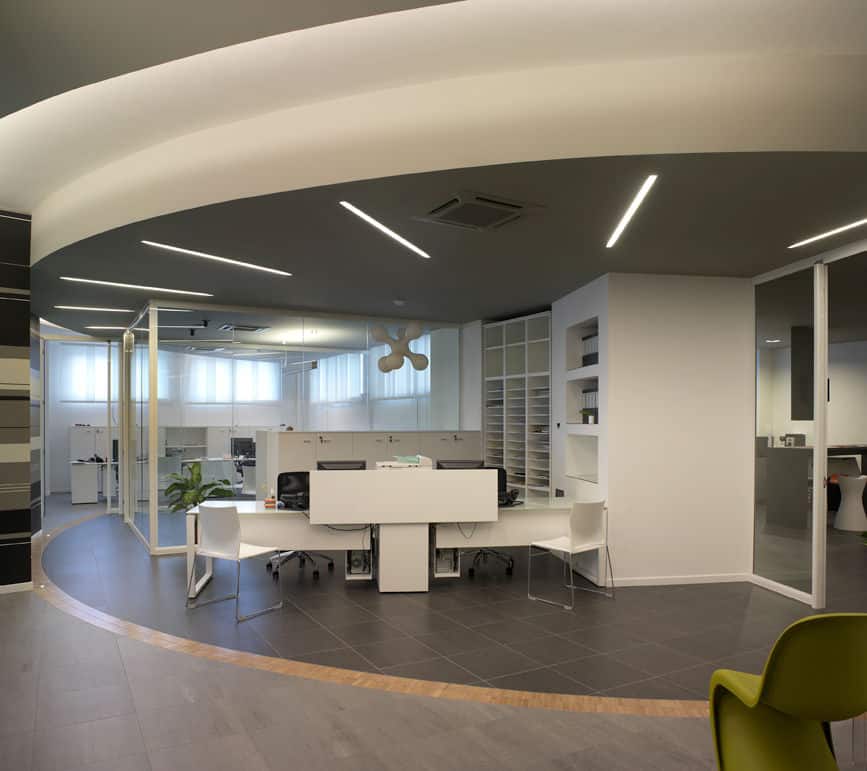 For the Dipa and Associates, a company that deals with road accidents, Architect Luca Mancini decided to shape the spaces by alternating black and white with clear crystal inserts. MINIFILE fittings, with their tiny 32mm width, were chosen in black, invisibly built-into the ceiling, which is also black. Only thin lines of artfully arranged light indicate pathways, while FILE 2H suspensions provide direct and indirect lighting in the work areas. The result is pleasant contrasting visual effects, with the whites and blacks in this rational yet at the same time friendly space.