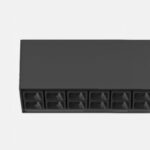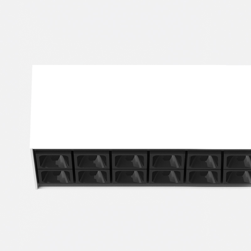 Proiettore compatto indoor da parete/soffitto costituito da un profilo in estruso di alluminio rettangolare, all'interno del corpo dell’apparecchio sono alloggiati in fila una serie di gruppi ottici da 10+10 led chip on board, lente e housing antiabbagliamento UGR<14. Grado di protezione IP20.