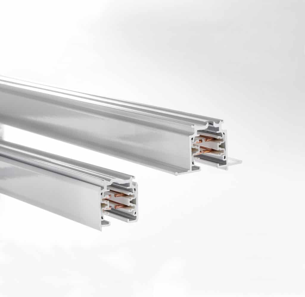 Binario elettrificato misto trifase (tre fasi e un neutro max 16A) con due conduttori aggiuntivi per la gestione di un qualsiasi segnale digitale o analogico (1-10V, DALI, dmx, lon, eib, ecc). La struttura è costituita da un estruso in alluminio verniciato a polveri epossidiche che incorpora quattro conduttori in rame (tre fasi e un neutro max 16A) e due conduttori in rame per il segnale di controllo, isolati mediante canalina in PVC. Conduttore di terra 4mm² incorporato nell’alluminio. Possibilità di gestione separata di tre circuiti On/Off oppure di gestione tramite segnale digitale (DALI). Il sistema è certificato secondo la norma EN 60570 e la sua installazione deve essere eseguita da personale qualificato e secondo la normativa d’installazione elettrica vigente. Sono previsti quattro tipi di fissaggio: direttamente a soffitto o a parete (in verticale), utilizzando le asole già previste nel binario, a soffitto o a parete (in verticale) tramite la clip metallica (da ordinare a parte), appeso tramite i kit di sospensione (da ordinare a parte) o a controsoffitto/a incasso senza superare i carichi massimi specificati. Da utilizzare con proiettori dotati di adattatore Eurostandard (per funzionamento standard) o DALI-Stucchi (per funzionamento DALI).