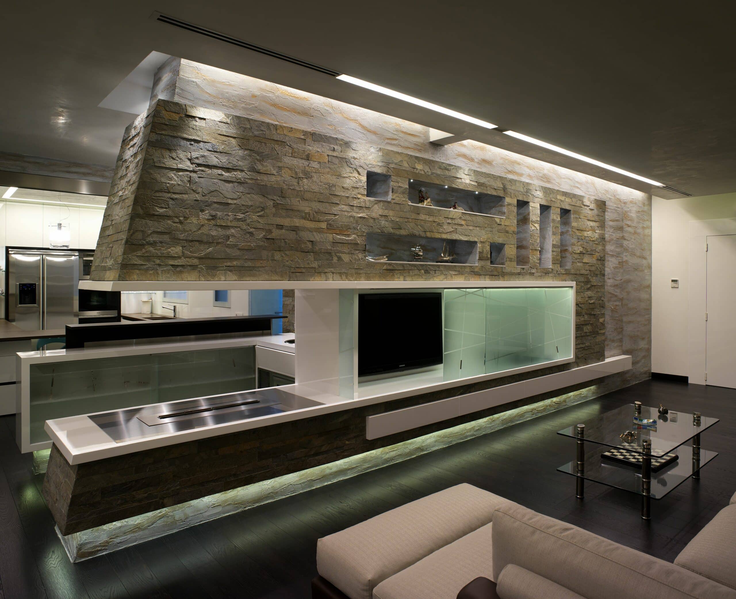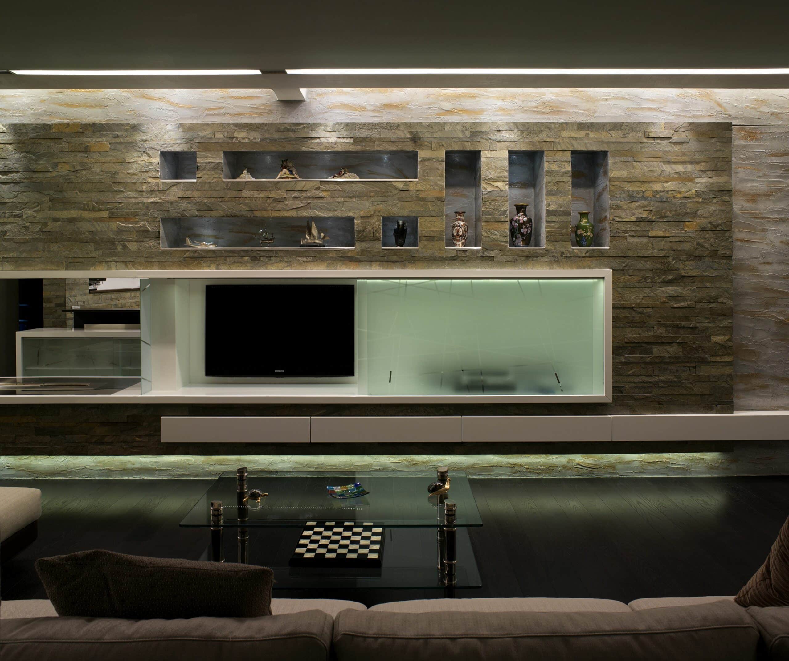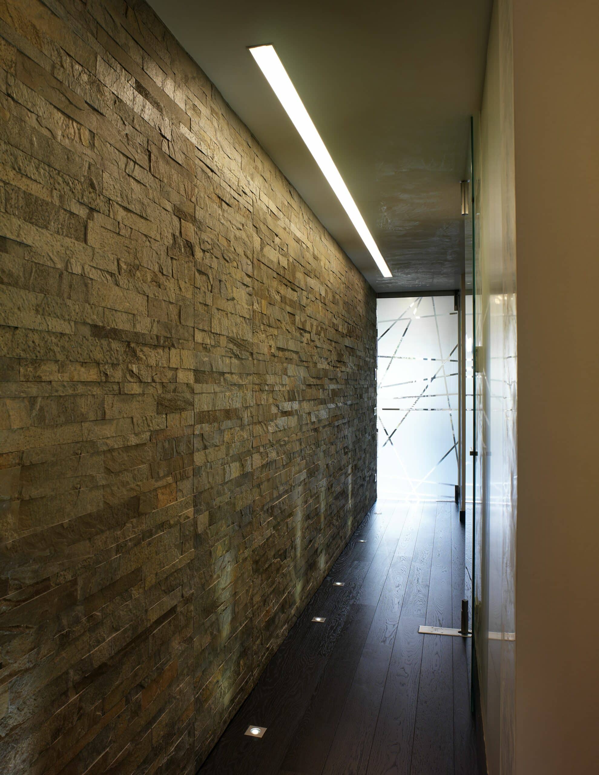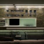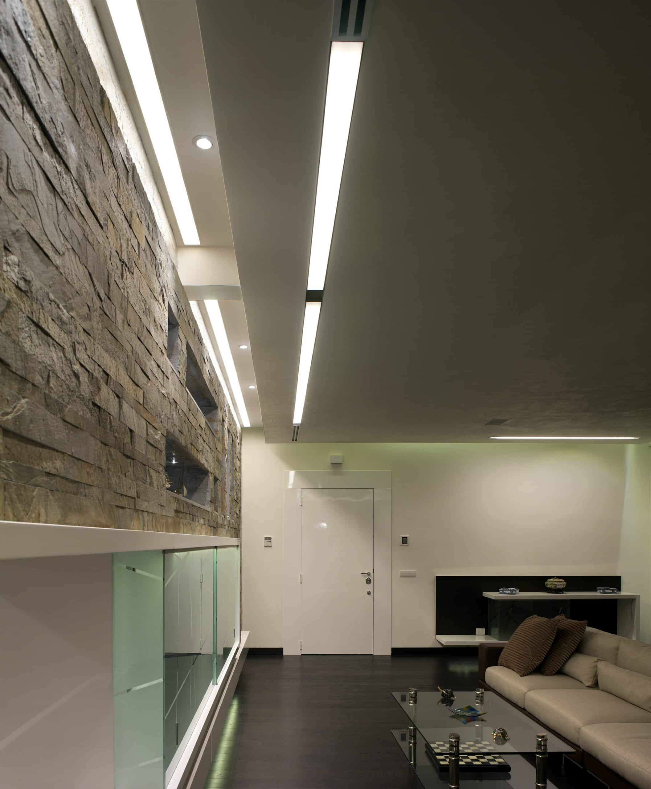 Per questi modernissimi ambienti privati sono state scelte le linee pulite di File 2 che nella versione ad incasso e con la sua linearità non contrasta con la ricchezza materica del progettista. FILE2 incasso è stato utilizzato sia nelle versioni moduli finiti con misure standard sia nella versione sistema componibile per illuminare i piani d’appoggio dell’ambiente cucina per una illuminazione senza ombre.