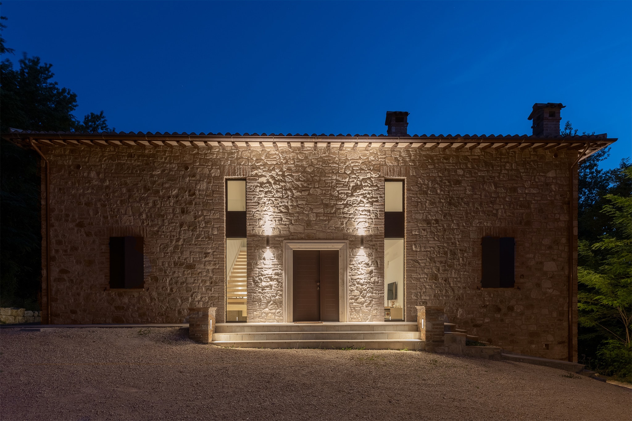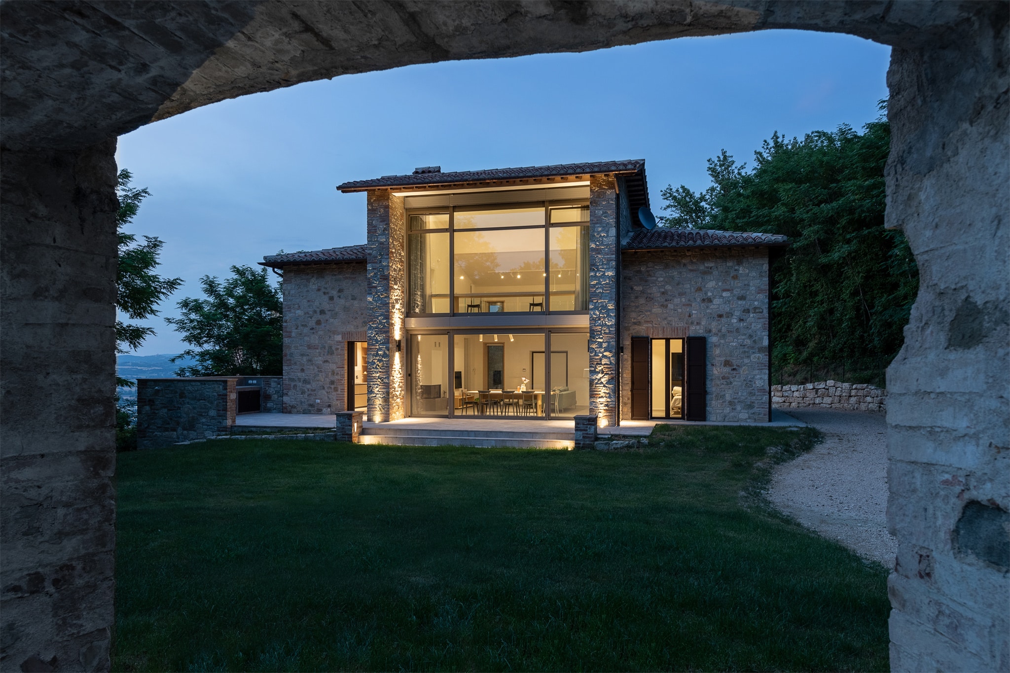 Siamo alle porte di Todi, cittadina medievale di una bellezza ed eleganza uniche, in un lotto che anticamente ospitava un poligono di tiro militare, ancora visibile nel caratteristico muro in pietra di fronte alla vecchia costruzione, elemento fortemente caratterizzante del progetto. E’ in questo luogo immerso nel verde, all’ombra del colle dove domina Todi e con la vista sulla vallata Perugina che la coppia italo-francese decide di stabilire la propria dimora estiva, nonché la casa deputata al relax, alla pace, al benessere.