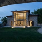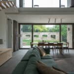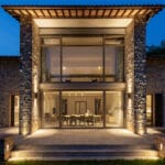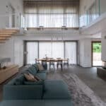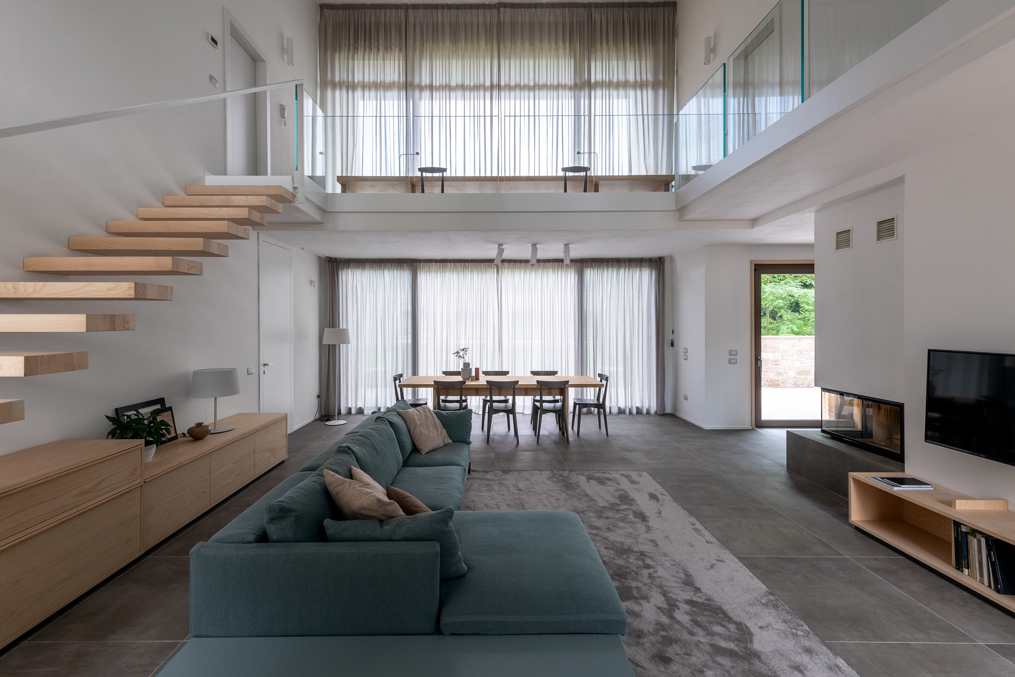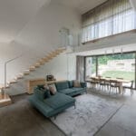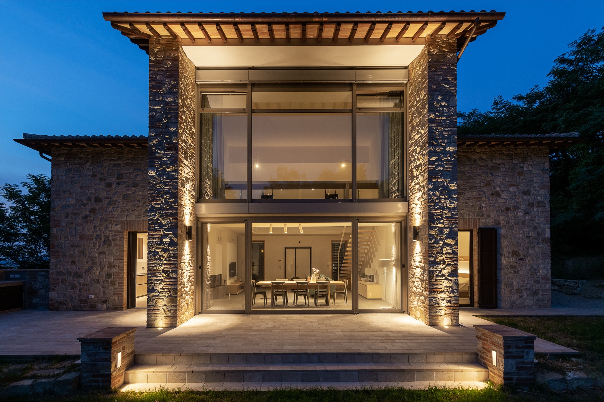 La casa si sviluppa su due piani principali: una zona giorno, camera padronale e servizi ben schermati da porte armadiate al piano terra e un grande piano scrivania con vista sul lotto esterno incorniciato da un ballatoio con affaccio sul salone oltre alle due camere ospiti al piano primo. Tutto collabora a creare un’immagine coordinata elegante e raffinata, messa in evidenza da accenti luminosi e un accurato studio della luce sia interno che esterno. Lo studio del verde, dei percorsi e dell’area retrostante la casa ha seguito la logica teatrale lavorando per quinte e schermi visivi consecutivi. Un progetto complesso in perfetto equilibrio tra la storicità del luogo e lo stile di vita contemporaneo.