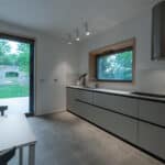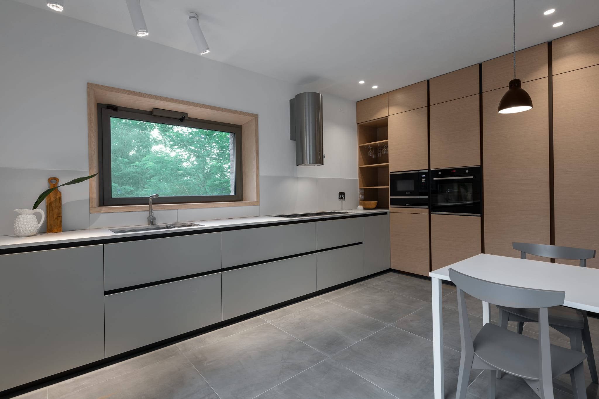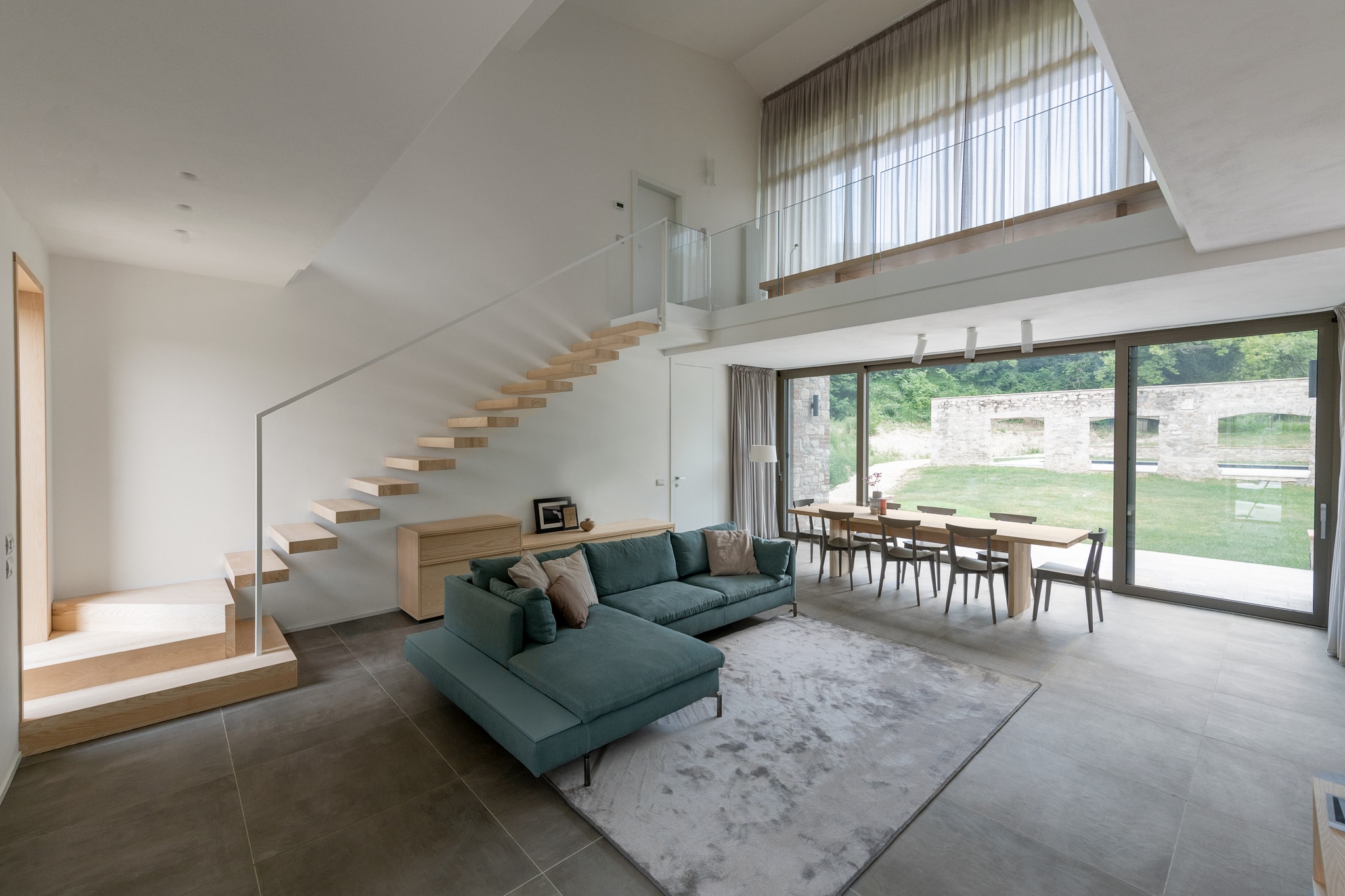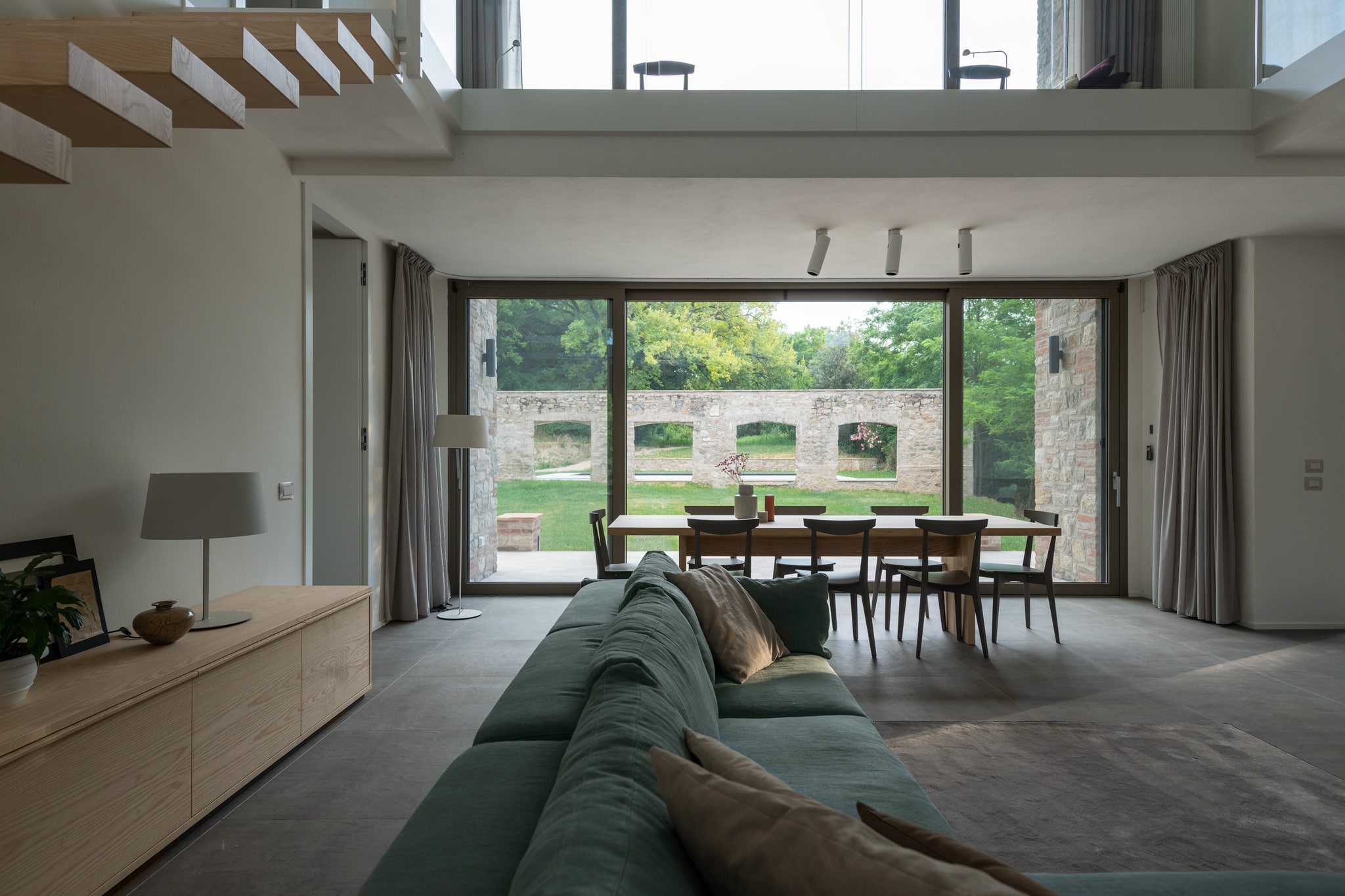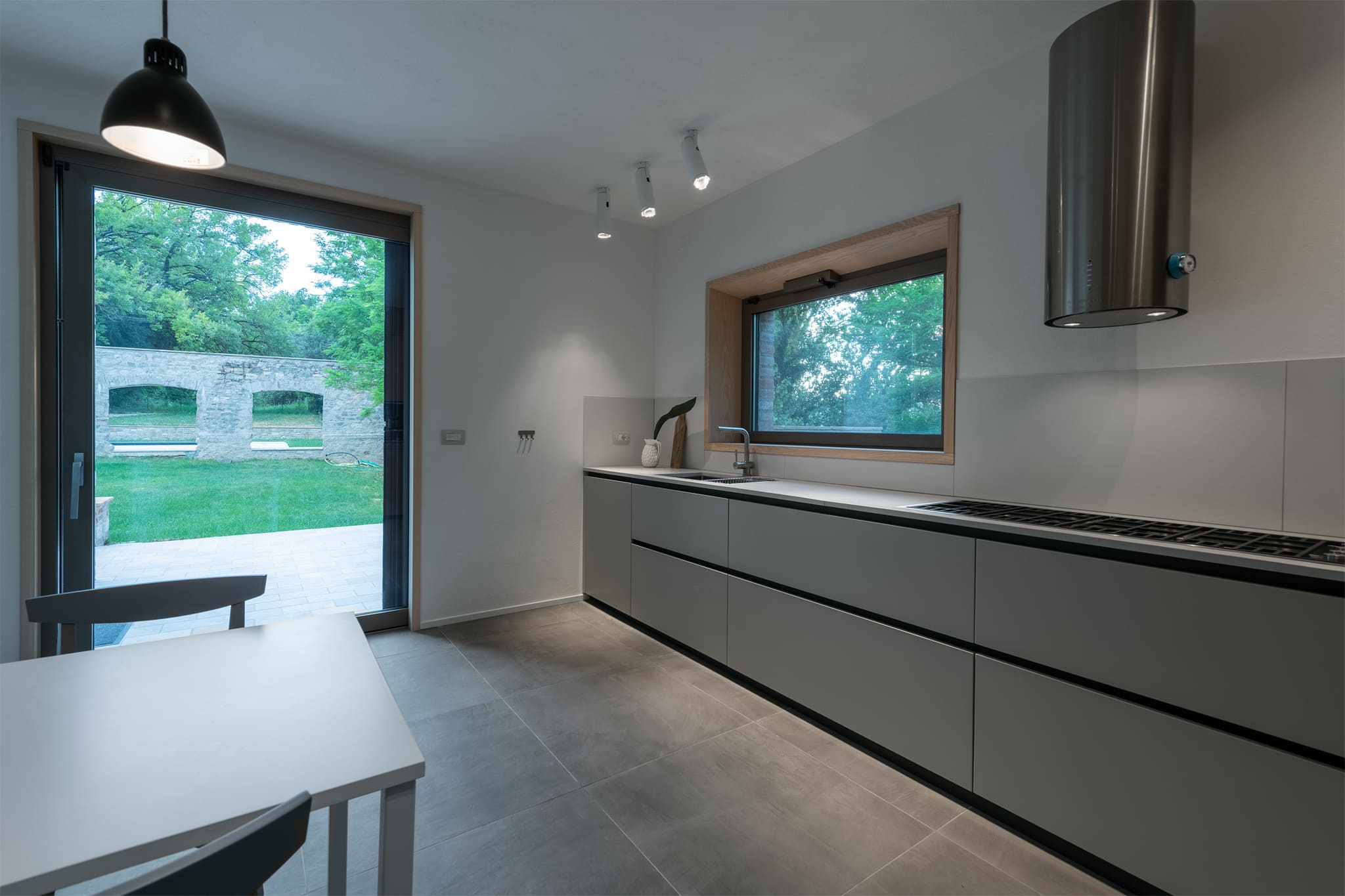 Alla ricerca di un’atmosfera accogliente, fortemente connessa con la natura e in perfetta sintonia con essa, il progetto prende spunto da questi forti elementi e dalla cortina in pietra, sede un tempo di antichi bersagli, per organizzare uno spazio interno razionale, essenziale nei volumi e nelle forme, coerente nel linguaggio univoco dei colori e dei materiali. Da qui la scelta di un unico legno, frassino naturale massello per tutti gli arredi disegnati su misura oltre a tutti gli imbotti delle aperture che conducono verso l’esterno nella piena volontà di incorniciare delicatamente la natura.