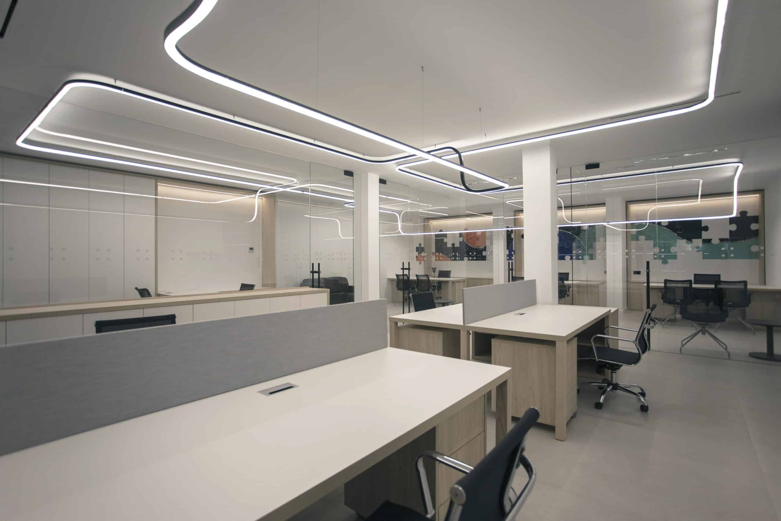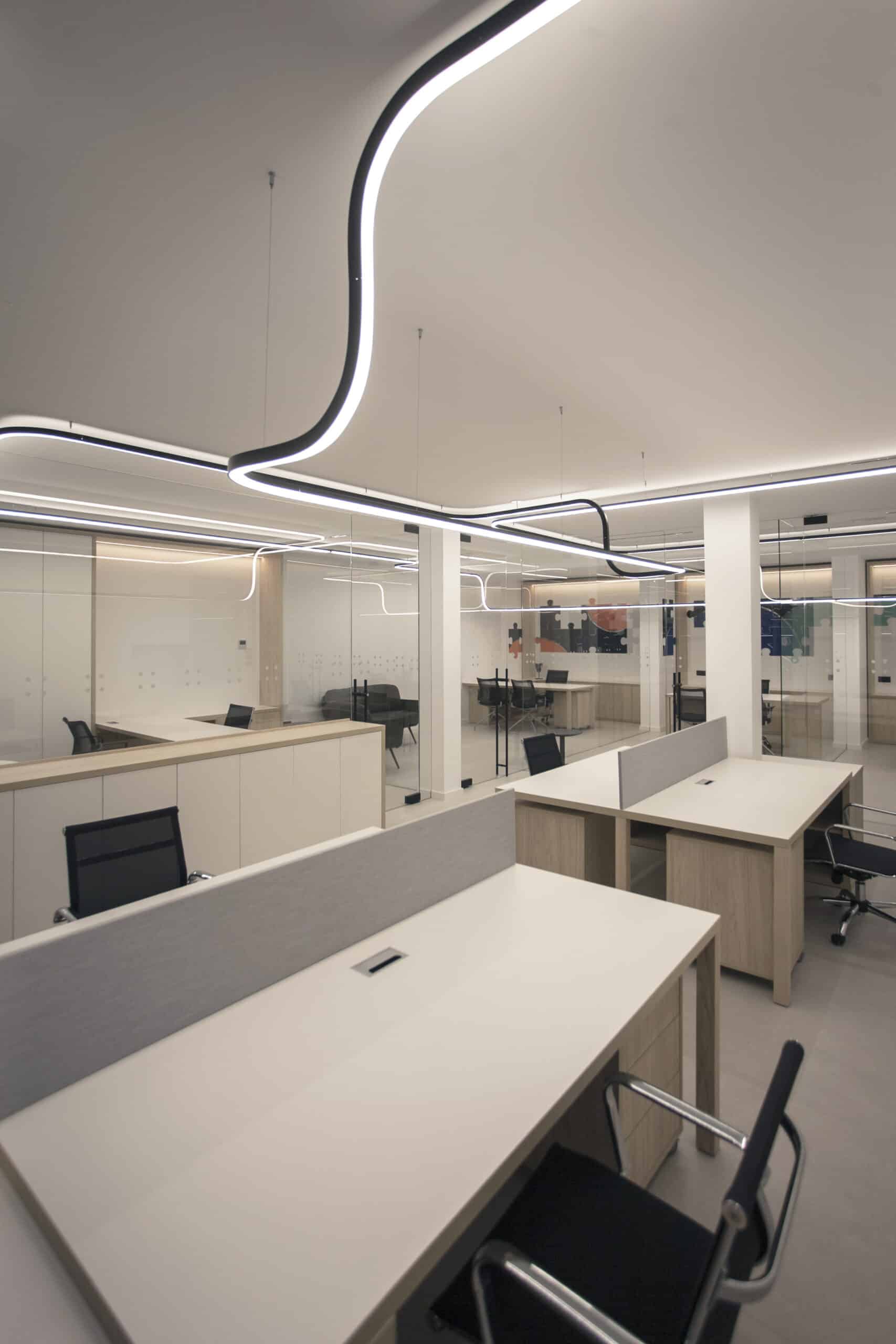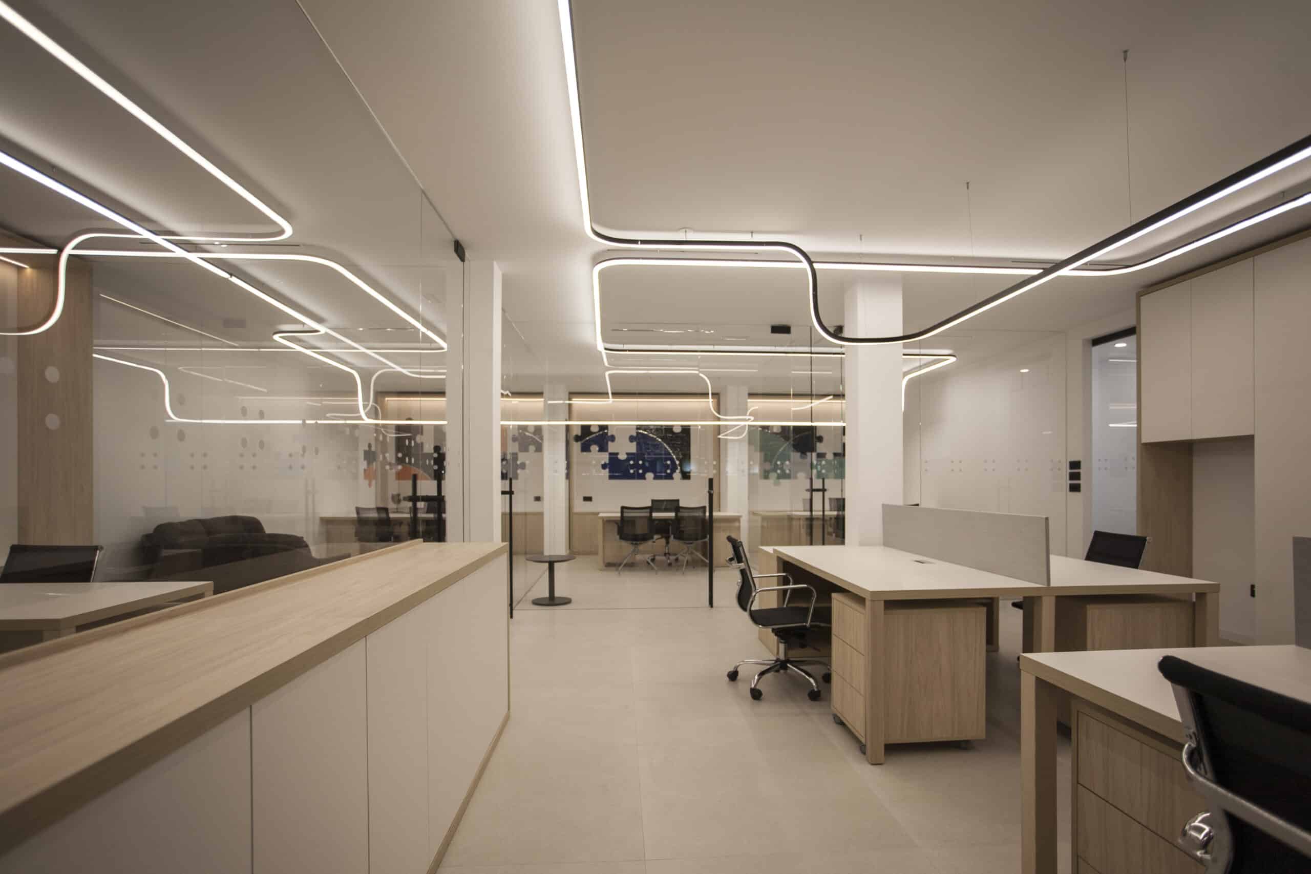 Il suo team professionale e dinamico affronta ogni progetto con velocità, adattabilità e sicurezza. Come da suo DNA ha affidato a Lucifero's, azienda italiana specializzata in illuminazione architettonica e su misura, la progettazione e la realizzazione dell'illuminazione per i nuovi uffici di Villena. Oscar Vidal Quist, Interior Designer, ha scelto la famiglia File Flex per l'illuminazione dello spazio, realizzando una sospensione senza limite di continuità visiva.